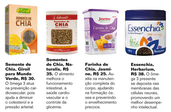 A aparência da chia é próxima a do gergelim, só que um pouco mais escura. Uma de suas vantagens é que pode ser consumida em sua forma natural, sem a necessidade de trituração para obter seus nutrientes, como exigem alguns outros grãos. Pode ser utilizada no preparo de bolos, pães e massas, além de ser normalmente consumido com cereais matinais, sopas, saladas, iogurtes, sucos, vitaminas e frutas. “A grande vantagem da chia é sua praticidade. A recomendação diária de ingestão é de uma colher de sopa”, afirma Carolina Chica. Para a nutricionista Tatiana Barão, a melhor forma de adquirir o máximo benefício da chia é com o consumo do grão inteiro. “O pó também é interessante, mas certas frações das fi bras e do ômega 3 são perdidas. E quanto às cápsulas de óleo de chia, elas não terão a ação sobre a saciedade, pois não fornecerão fi bras, apenas as gorduras da semente. Por outro lado, o óleo é uma ótima alternativa para a suplementação de maior quantidade de gorduras poli-insaturadas, principalmente o ômega3, mas não fornece todos os benefícios do grão”, pondera a especialista.
